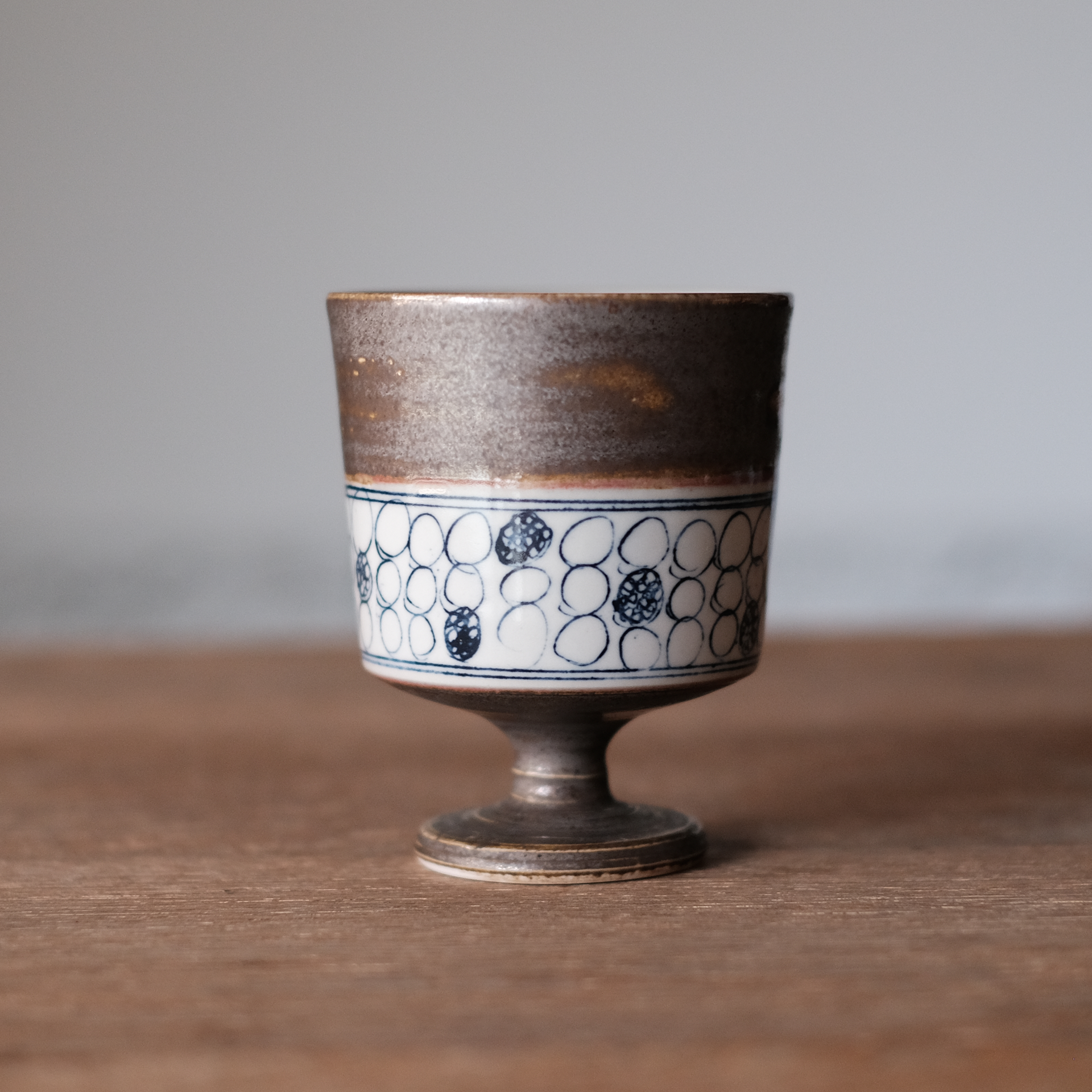 象嵌の技法を用いた手書きの模様と、金属が反応する茶色の釉薬で装飾された華やかなゴブレット。