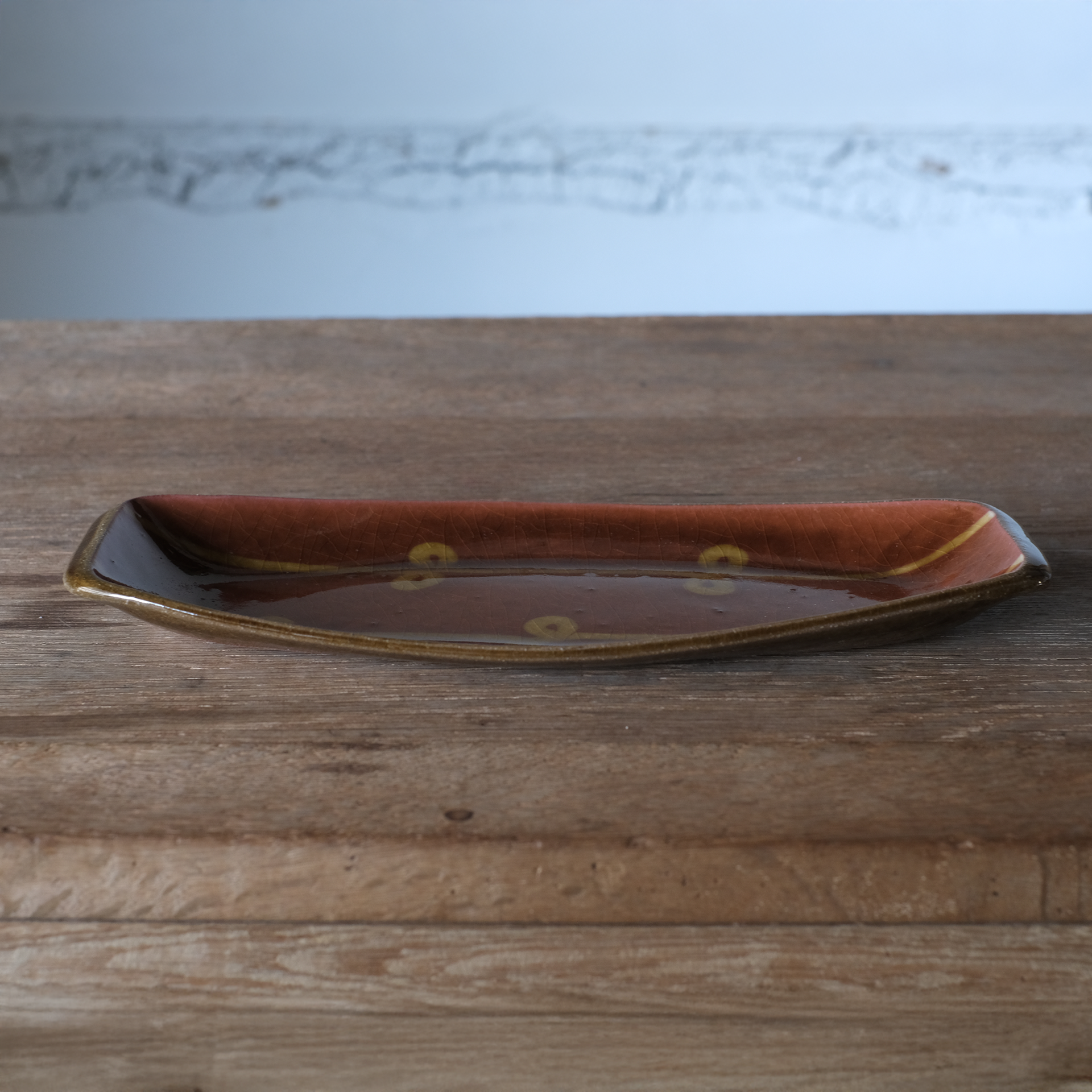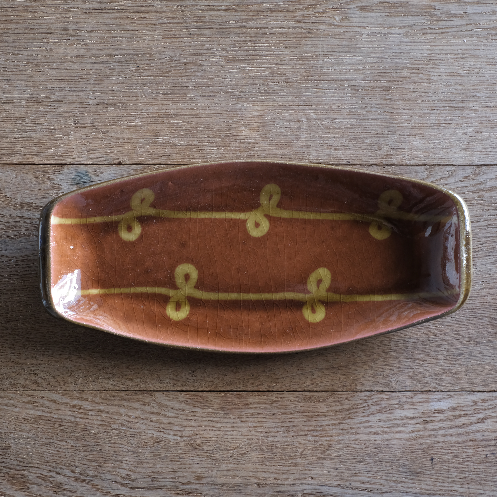 鳥取県の因州中井窯で修行した後に独立し、現在は独学で学んだスリップウェアの技法でうつわを製作しています。今津さんの作品は、ぽってりとした形状と丸みのある線、そして優しい色合いが特徴です。