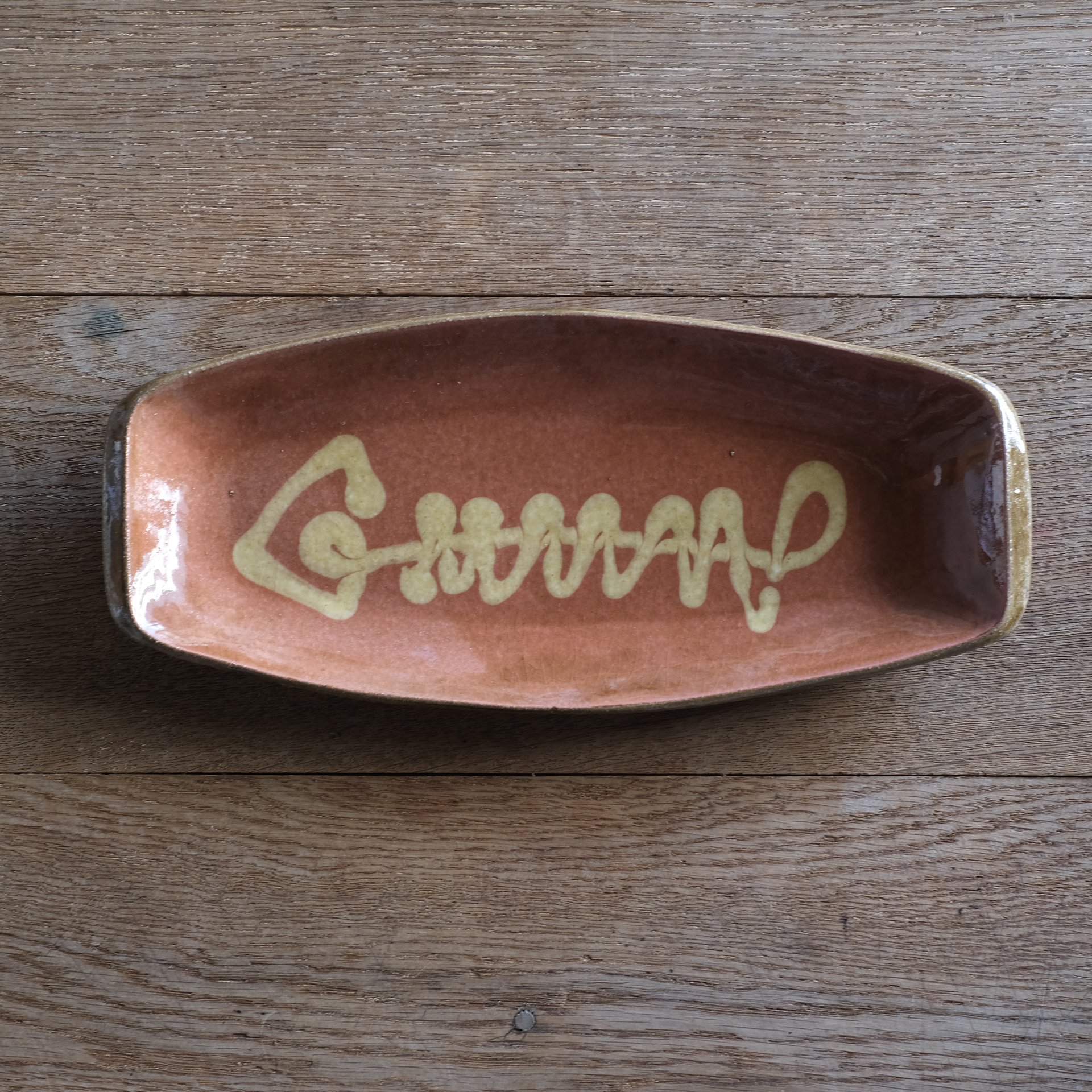 鳥取県の因州中井窯で修行した後に独立し、現在は独学で学んだスリップウェアの技法でうつわを製作しています。今津さんの作品は、ぽってりとした形状と丸みのある線、そして優しい色合いが特徴です。