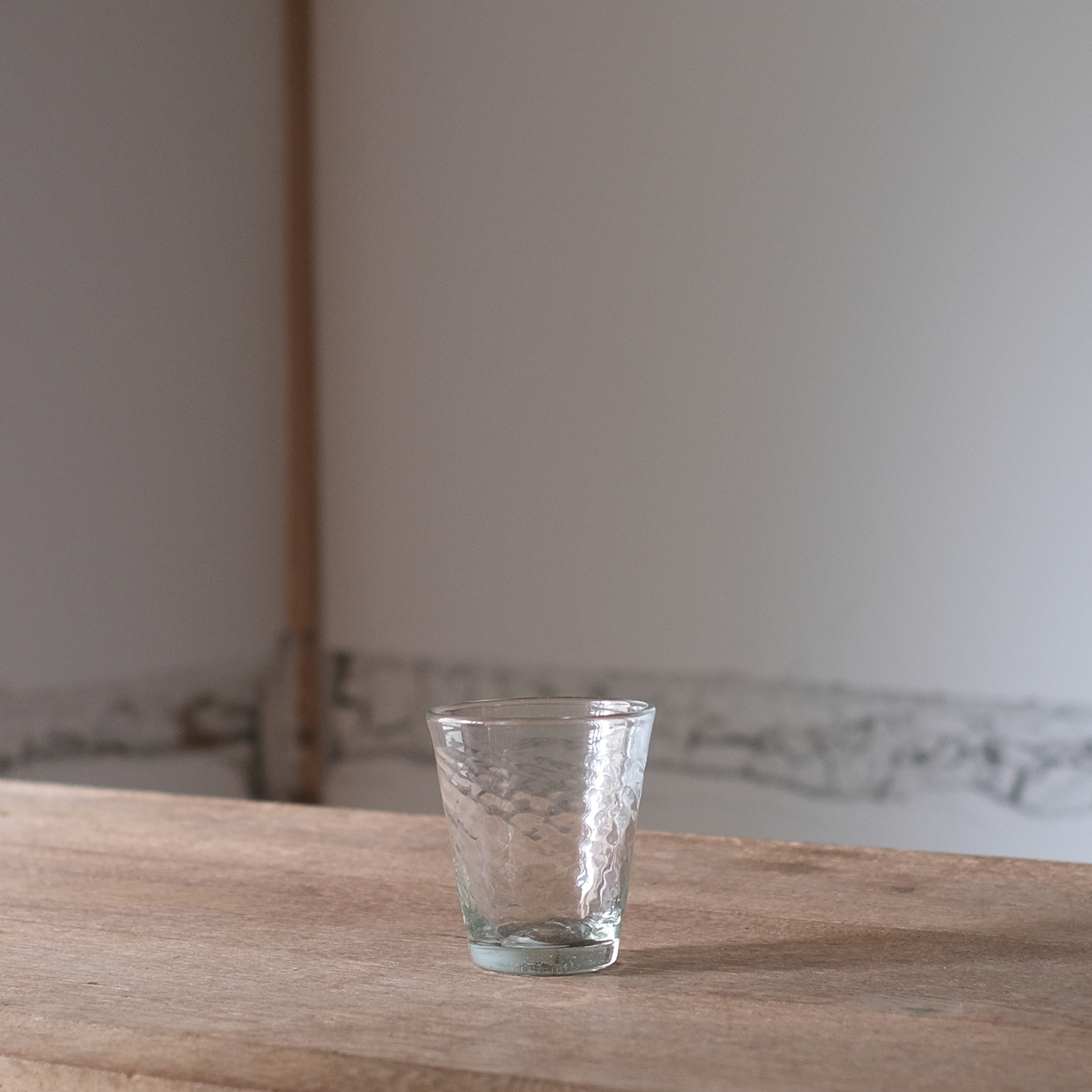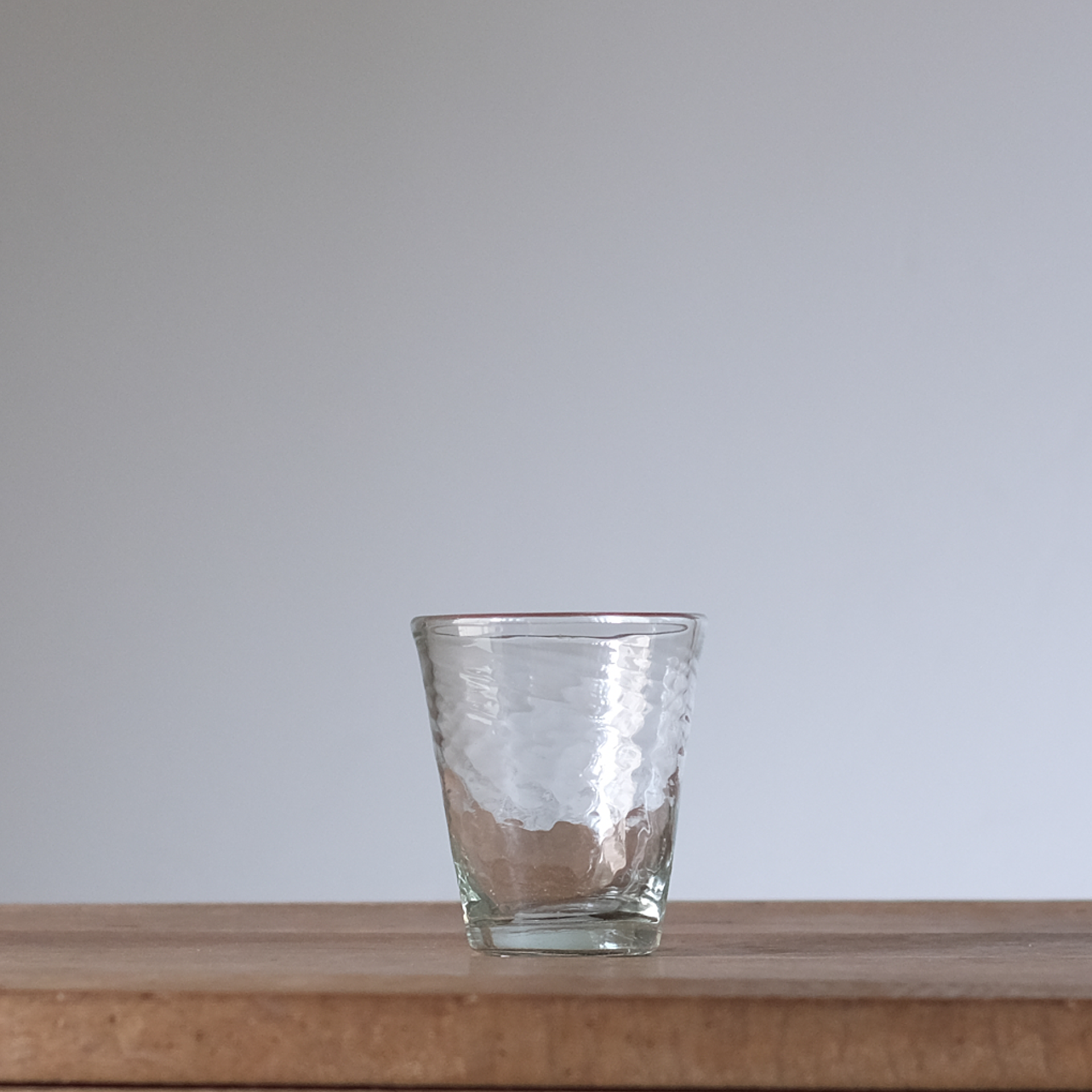 装飾的な美しさではなく、普段の暮らしの中で気軽に使える、用の美を追求している平岩さんのガラスは、持ち易く、手にすっと馴染みます。そして再生ガラスのもつ柔らかな輝きと、少し厚みがあるのが特徴です。