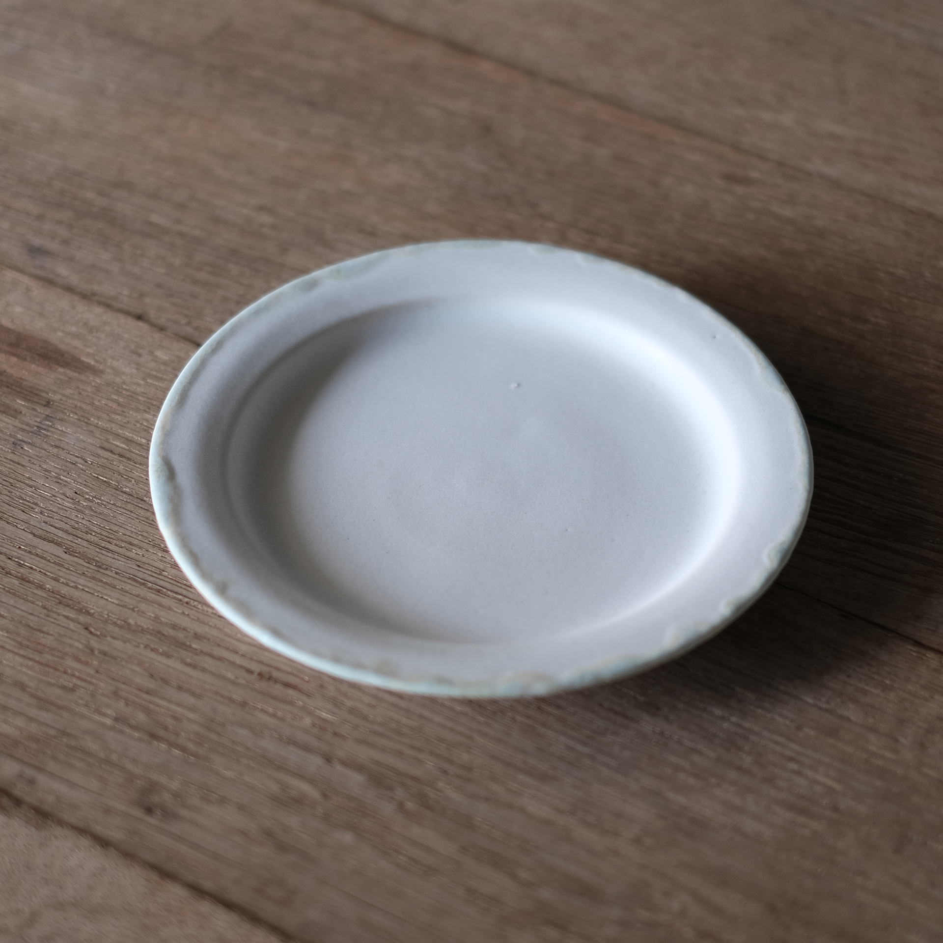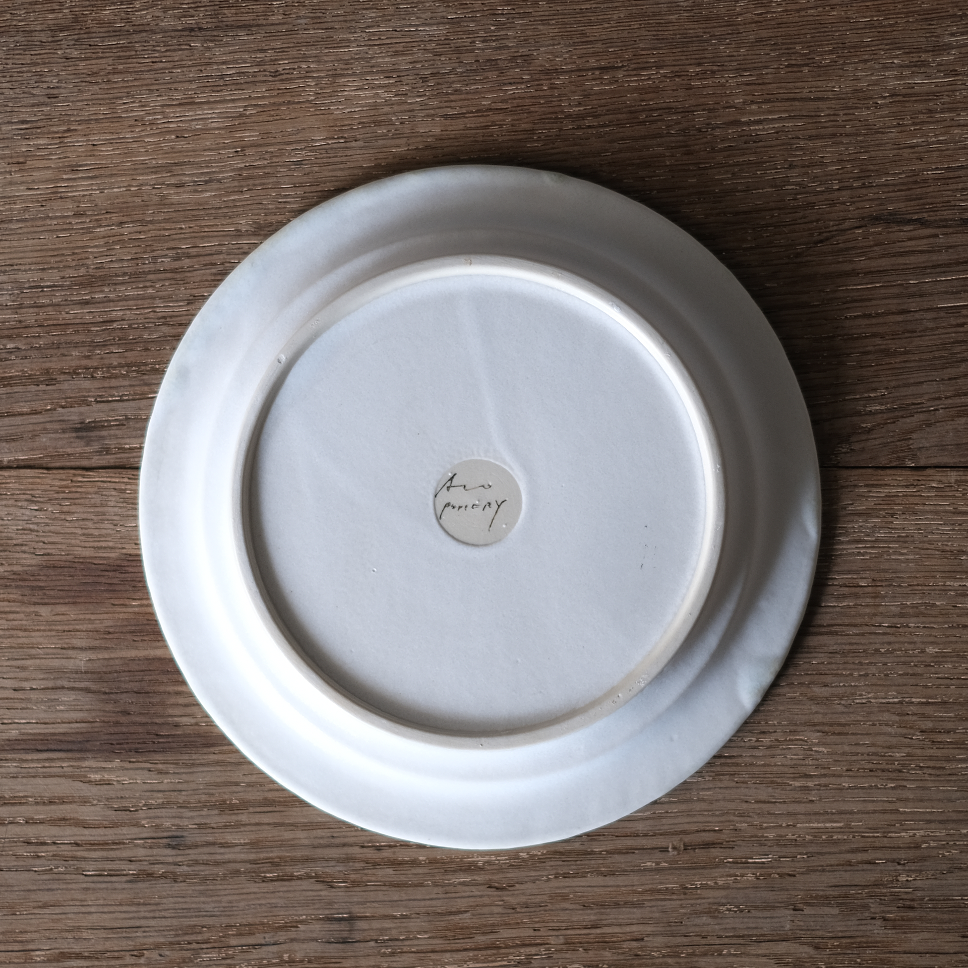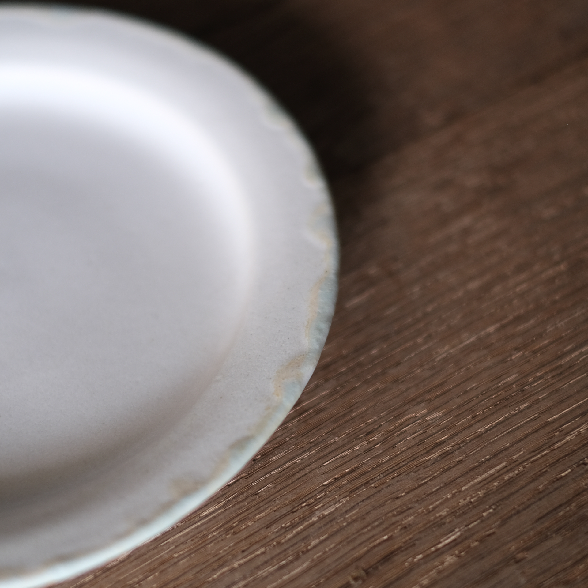 縁にかけて広がる淡いグリーンの釉薬が特徴のリムプレート。
