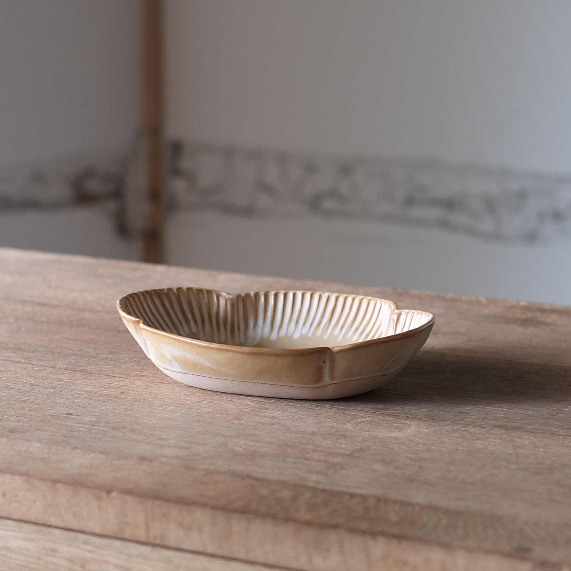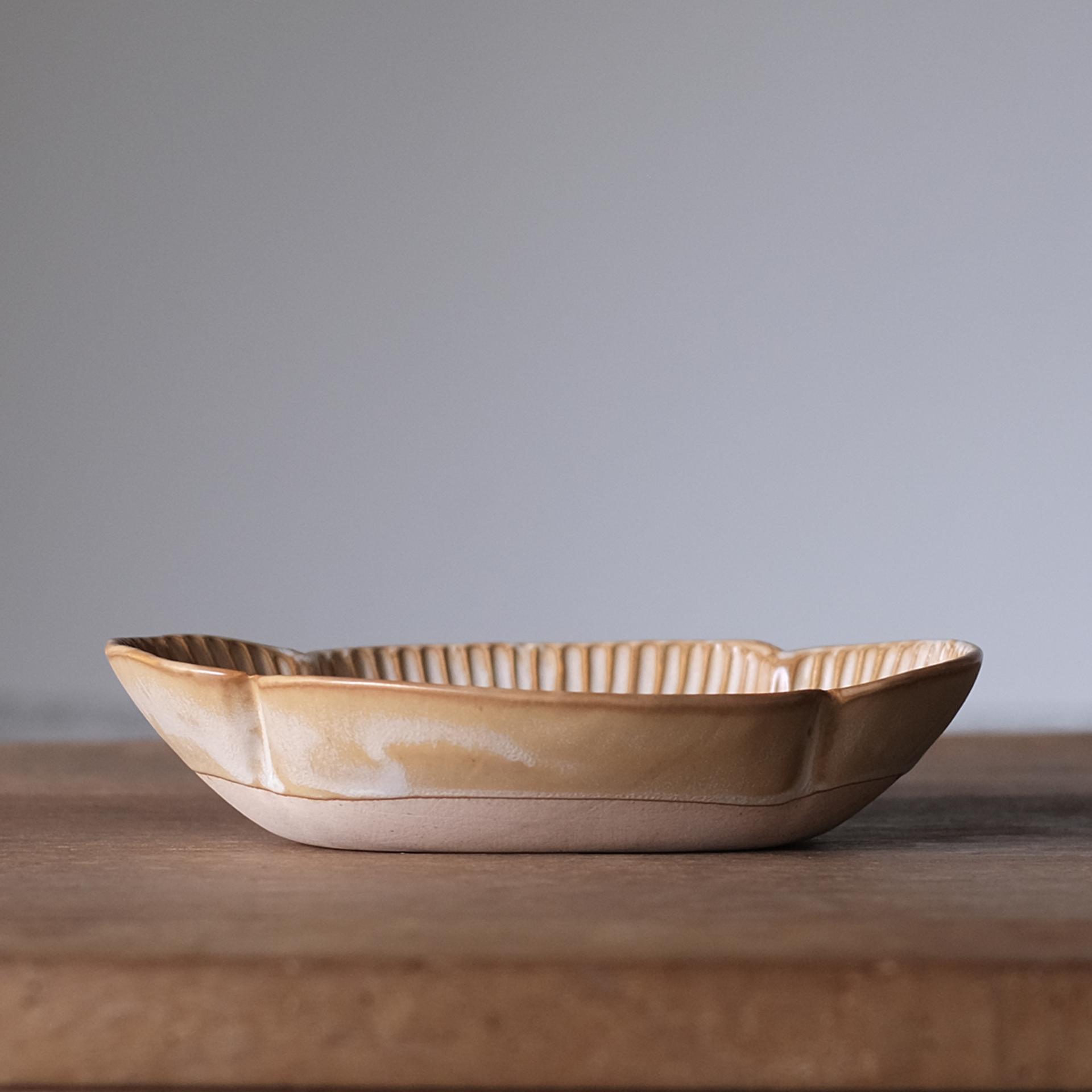 丸でも長方形でもないこの木瓜のかたちが周りの器とよく馴染み、食卓にリズムがうまれます。アンティーク調の耐熱皿は見た目以上に軽く、扱いやすいのも嬉しいポイントです。