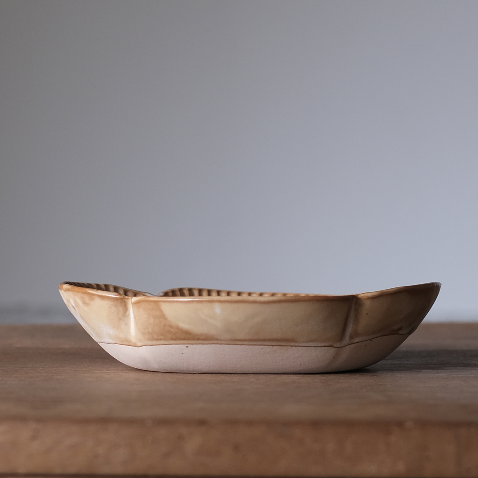 丸でも長方形でもないこの木瓜のかたちが周りの器とよく馴染み、食卓にリズムがうまれます。アンティーク調の耐熱皿は見た目以上に軽く、扱いやすいのも嬉しいポイントです。