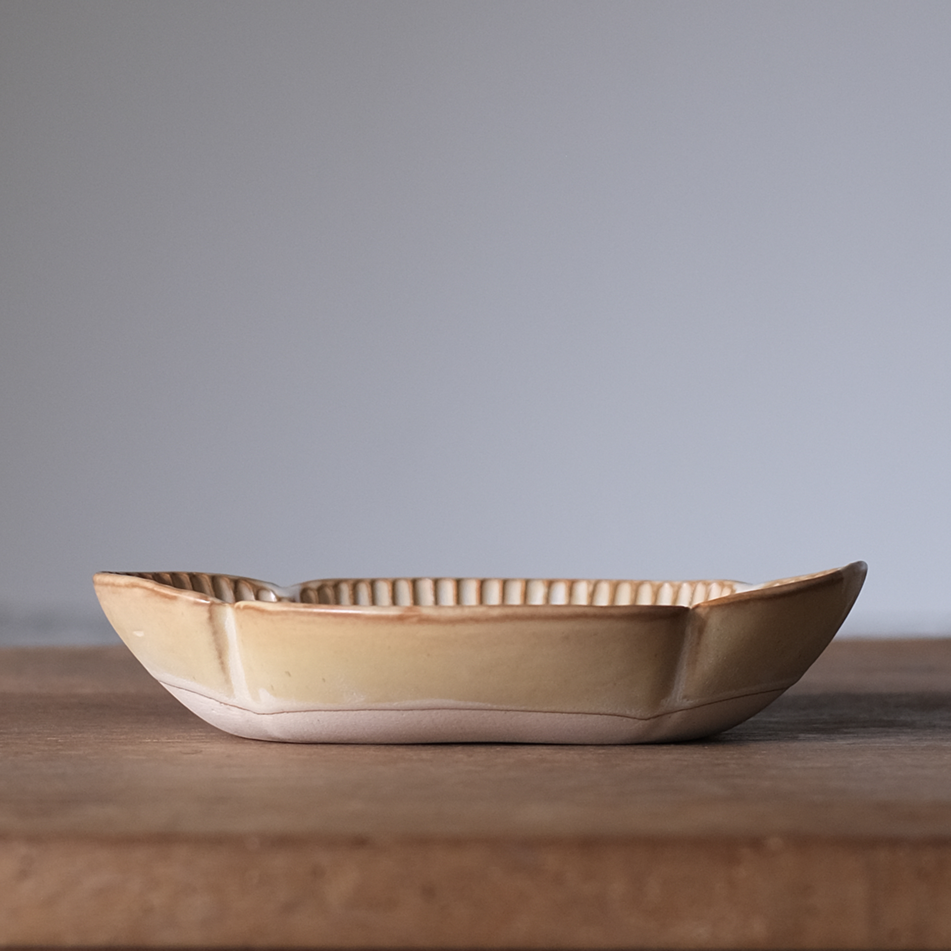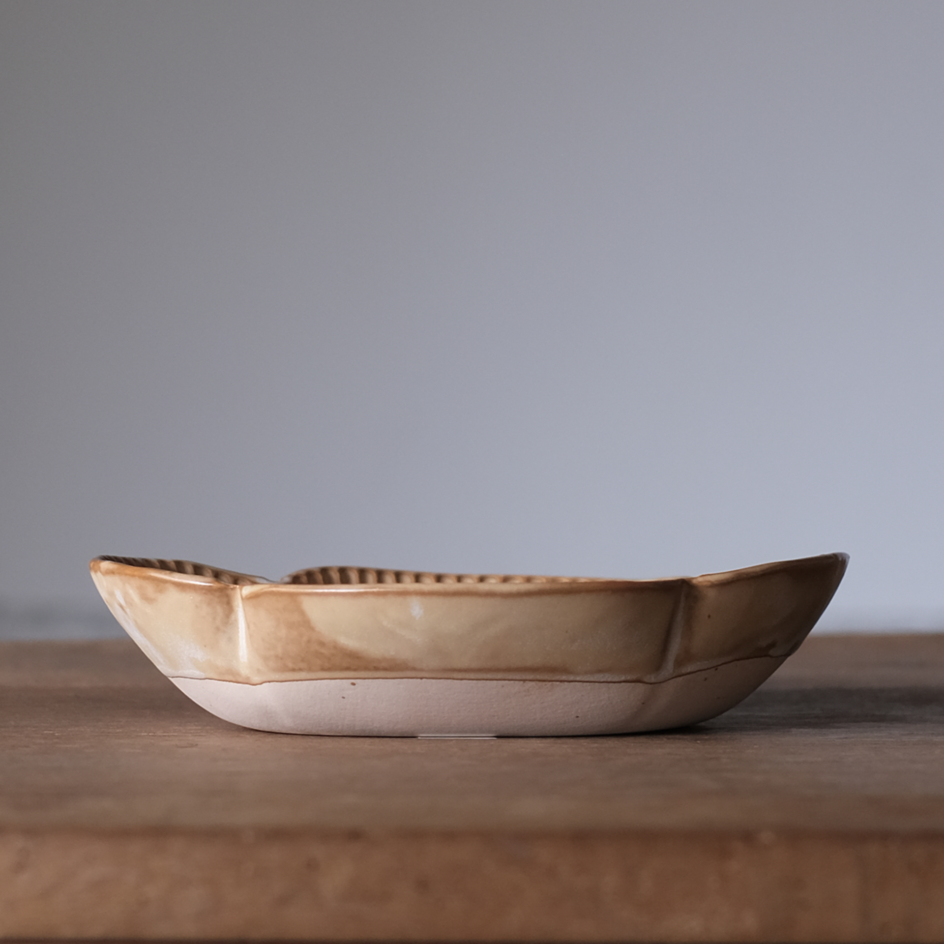 丸でも長方形でもないこの木瓜のかたちが周りの器とよく馴染み、食卓にリズムがうまれます。アンティーク調の耐熱皿は見た目以上に軽く、扱いやすいのも嬉しいポイントです。