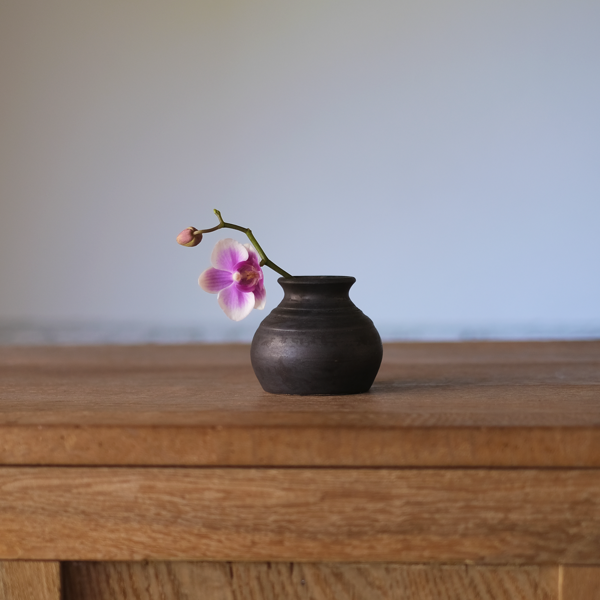 花を飾らない時でも、静かな黒の佇まいが空間を引き締め、インテリアの一部としてお楽しみいただけます。