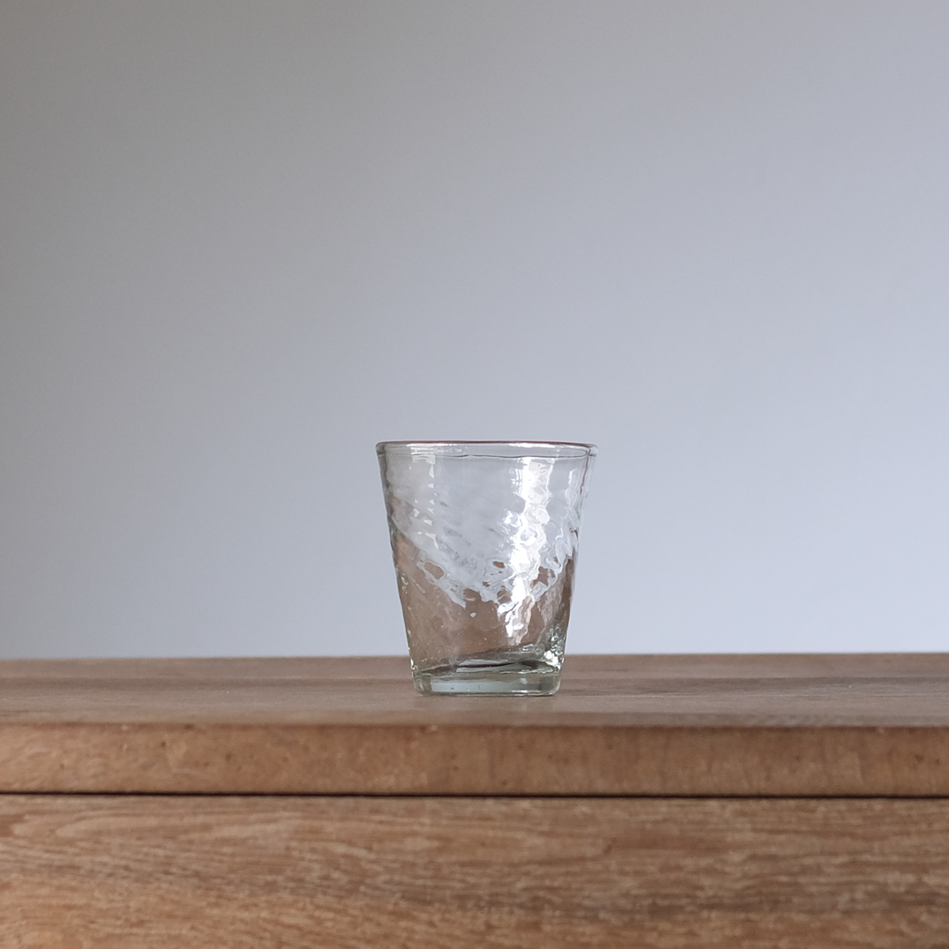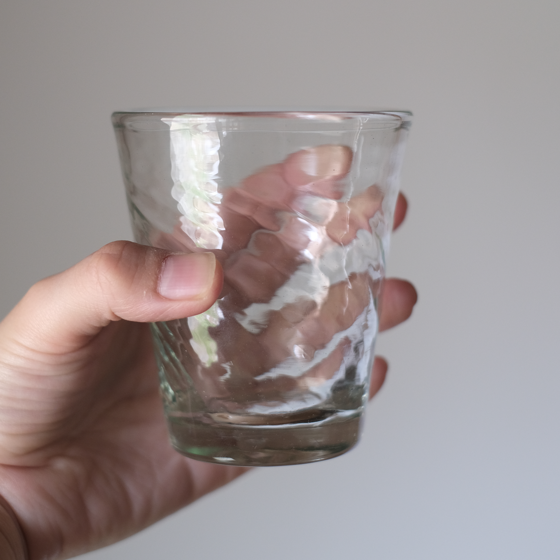 温かみが感じられるやさしいフォルムのガラスのコップ。 ゆらゆらとした表面の模様は、繊細に捻られたモールの模様。
