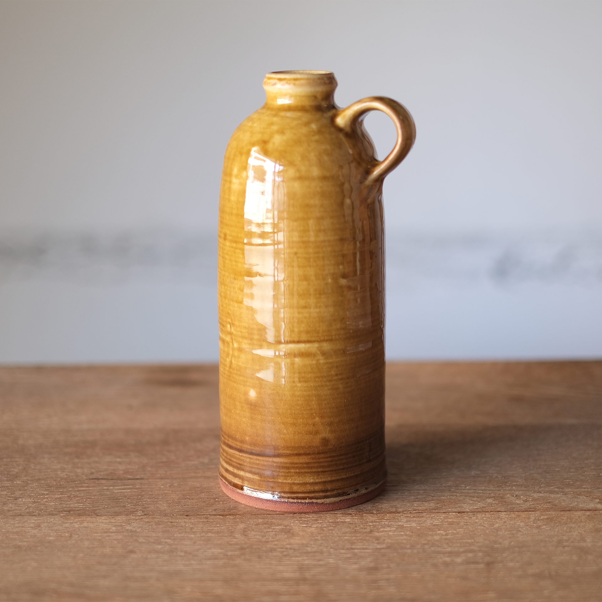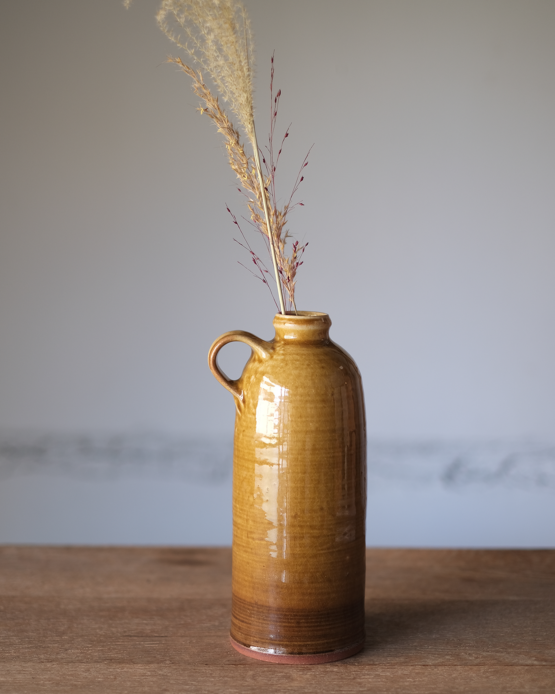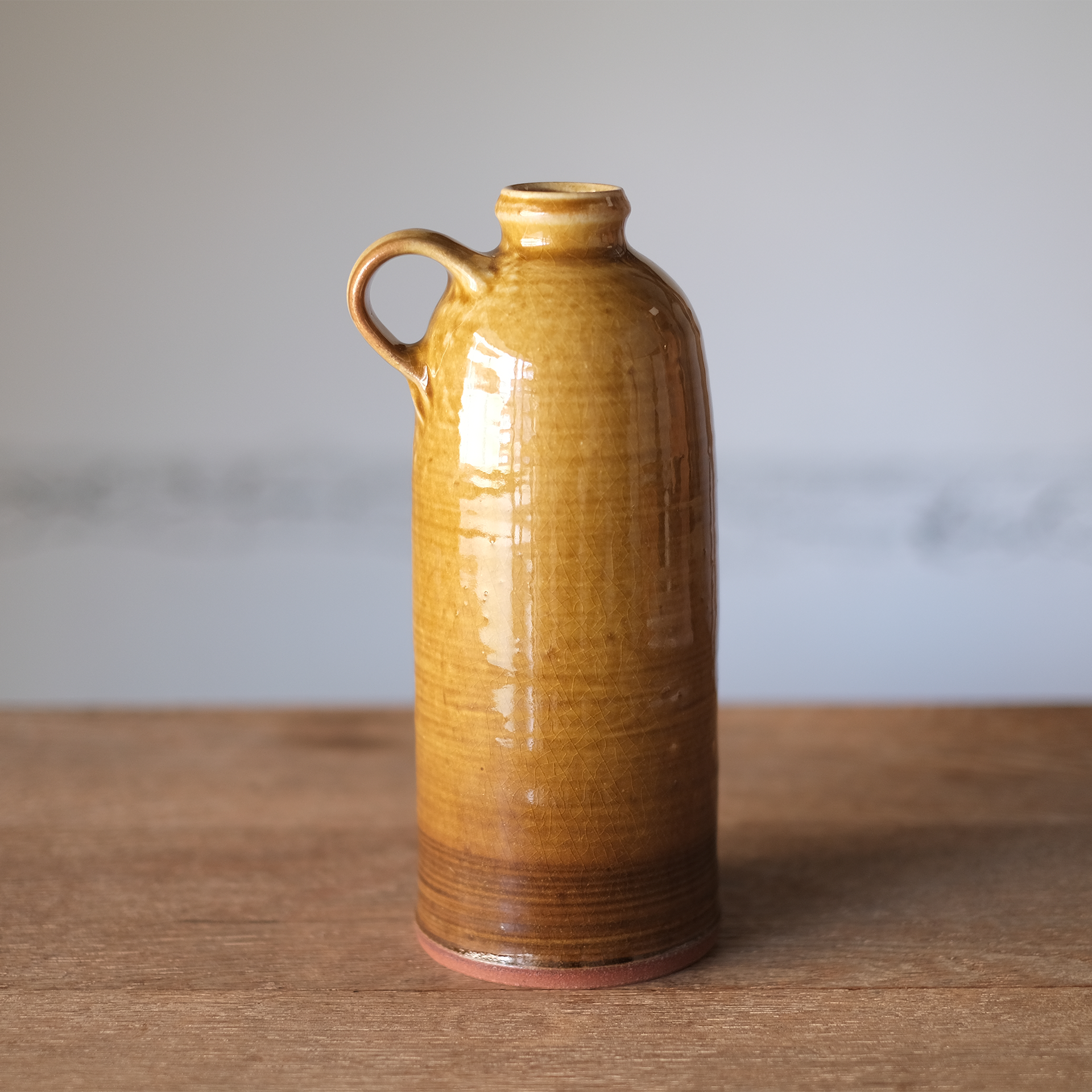 ぽってりとした優しい色合いに小さなハンドルがなんともかわいらしい花入れです。