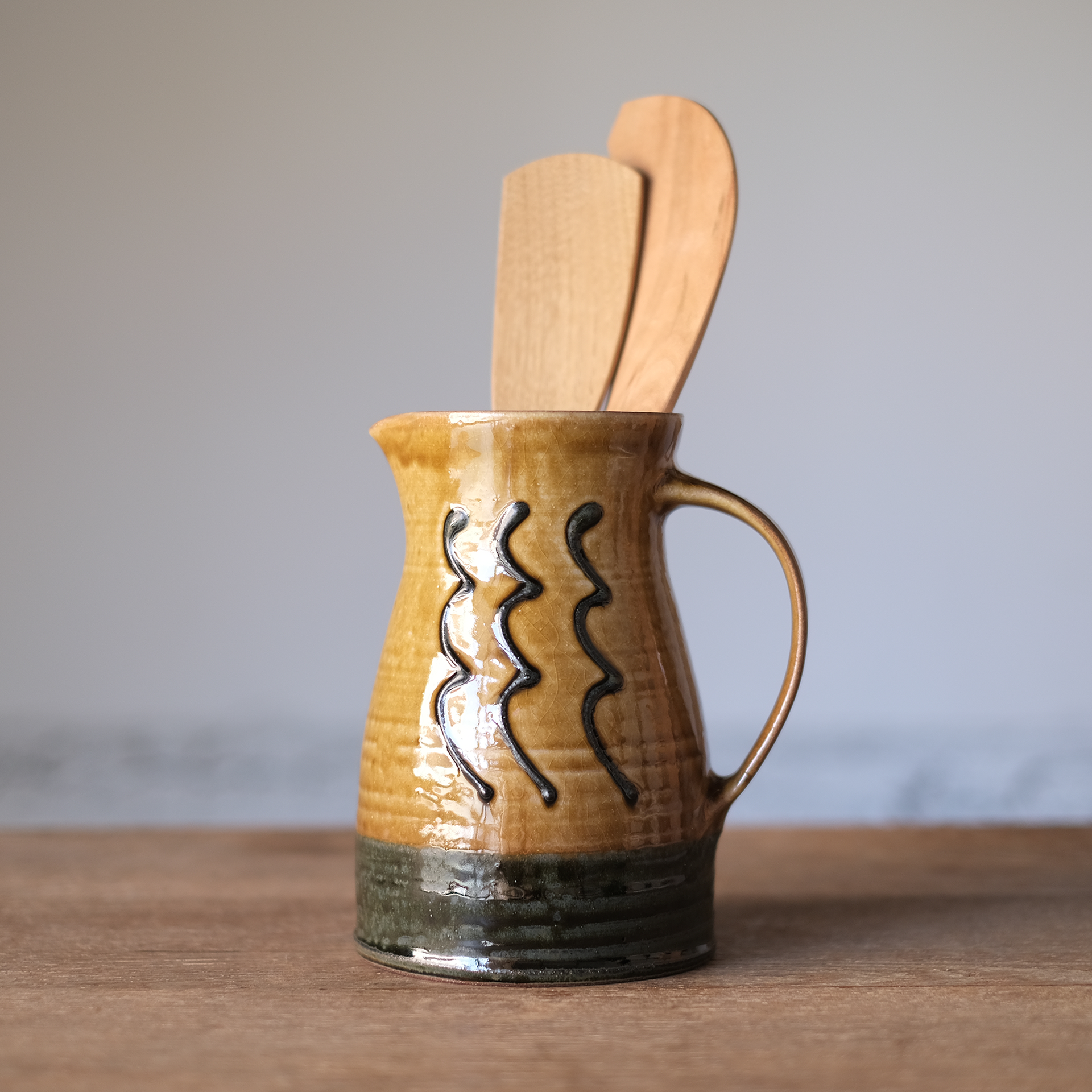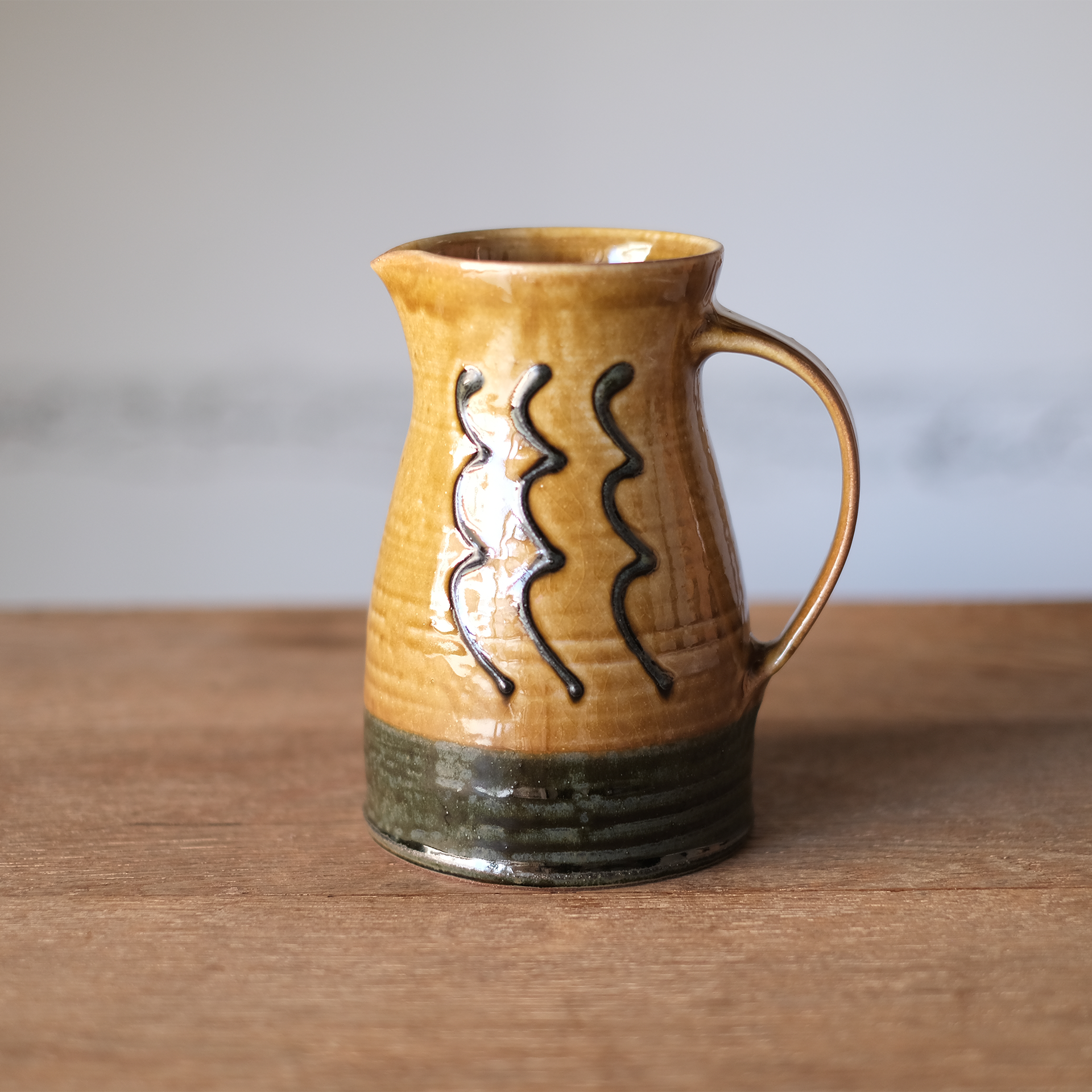 黄色と緑の釉薬がかけ分けられたピッチャー。