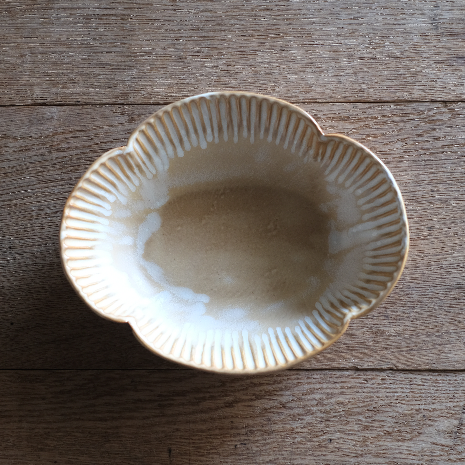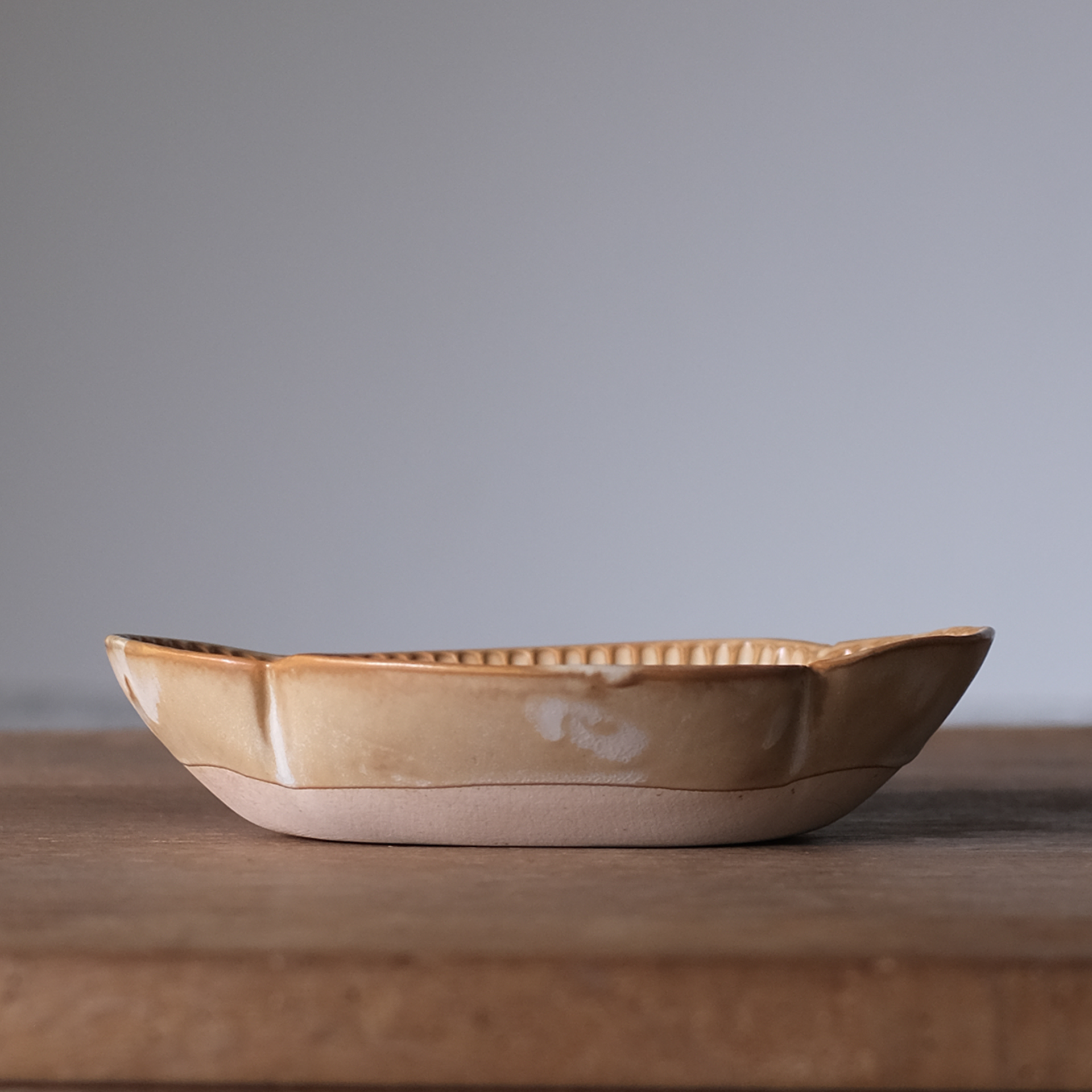 丸でも長方形でもないこの木瓜のかたちが周りの器とよく馴染み、食卓にリズムがうまれます。アンティーク調の耐熱皿は見た目以上に軽く、扱いやすいのも嬉しいポイントです。