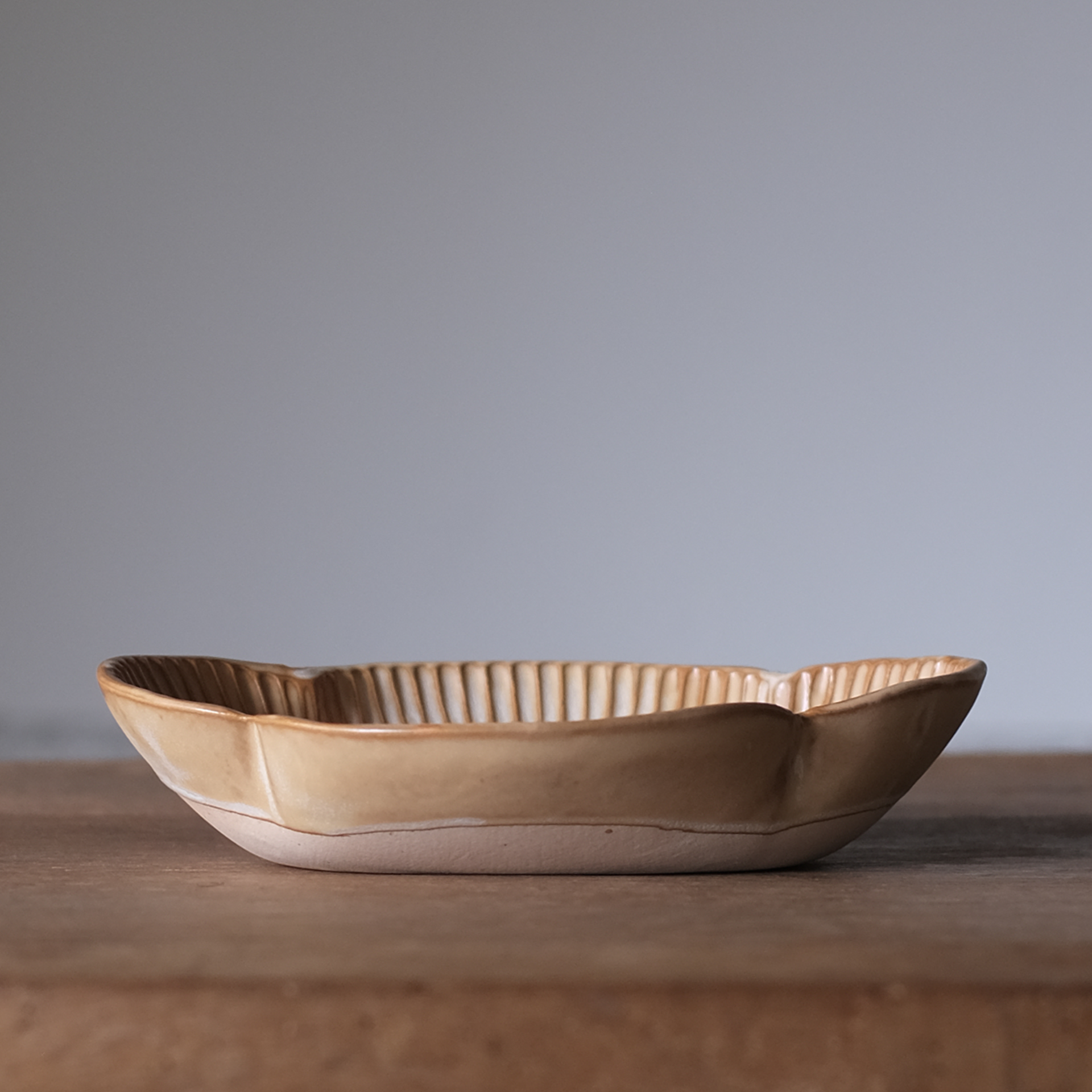 丸でも長方形でもないこの木瓜のかたちが周りの器とよく馴染み、食卓にリズムがうまれます。アンティーク調の耐熱皿は見た目以上に軽く、扱いやすいのも嬉しいポイントです。