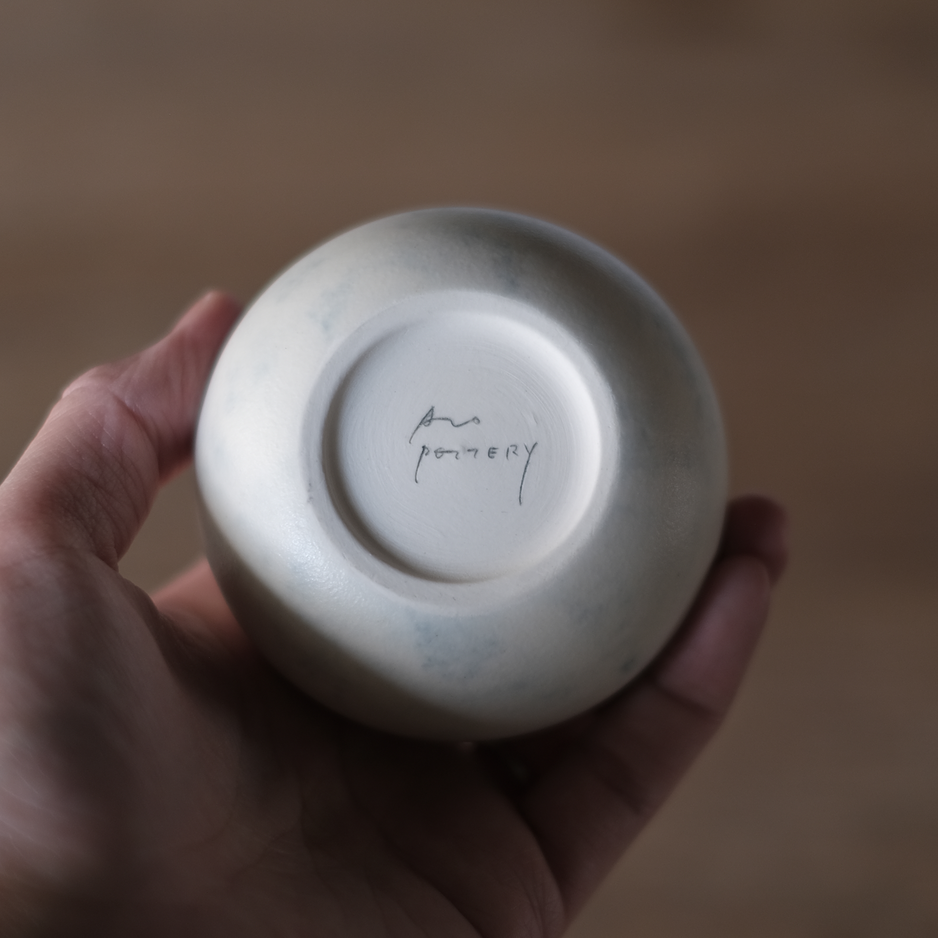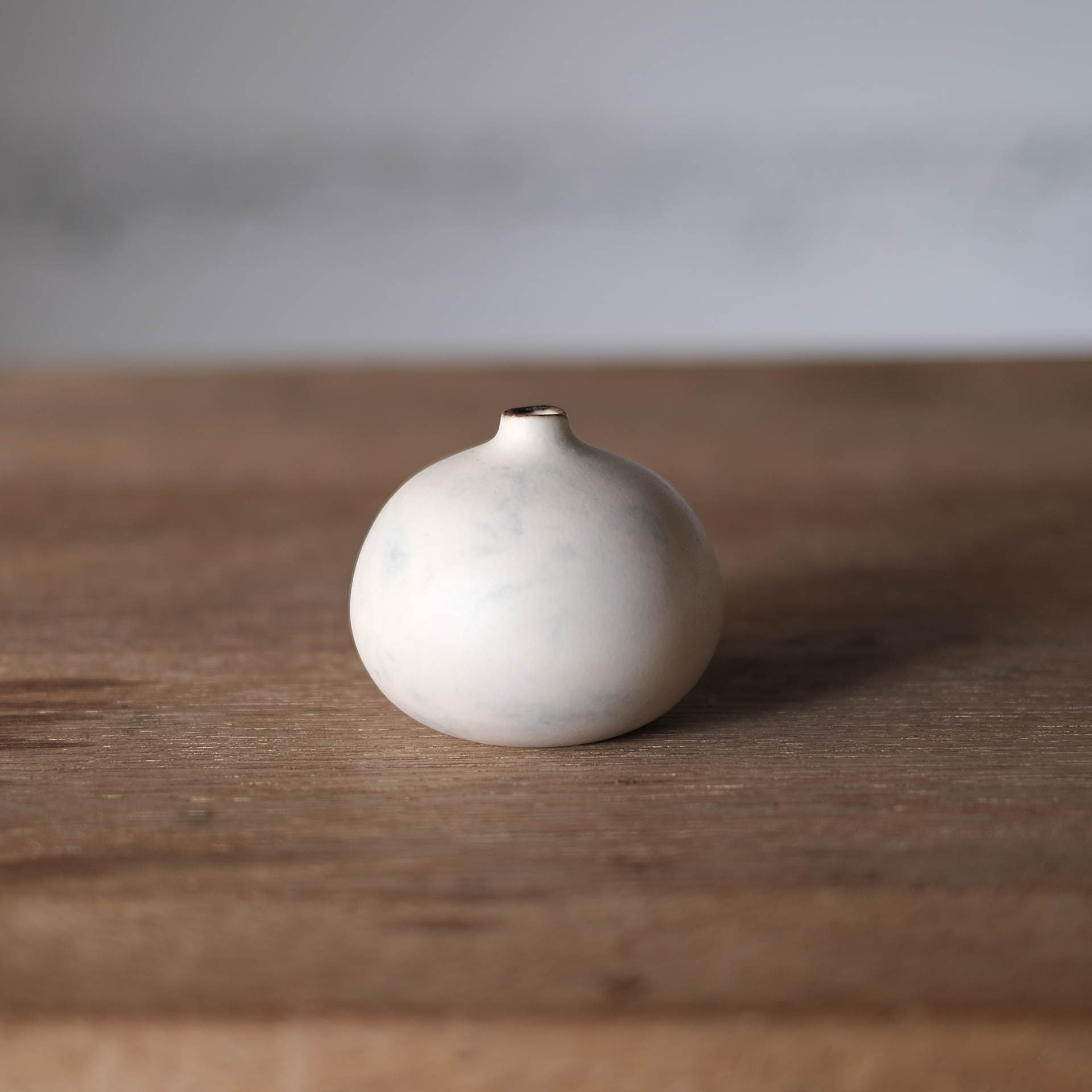 質感はなめらかで、表面は青い釉薬がところどころ施されていて大理石のような表情。また口の部分に施された優しいブラウンの釉薬が特徴です。
