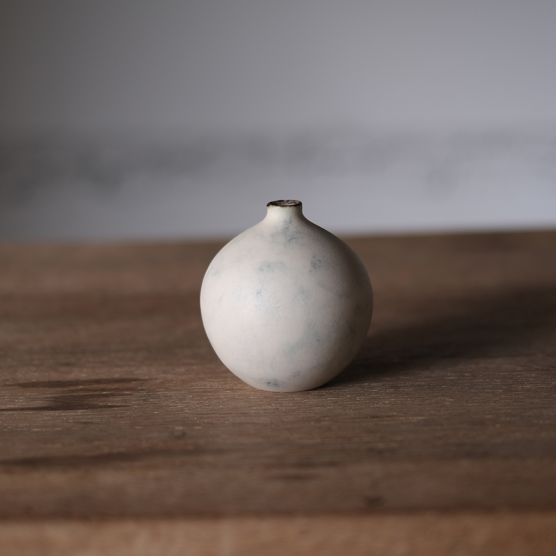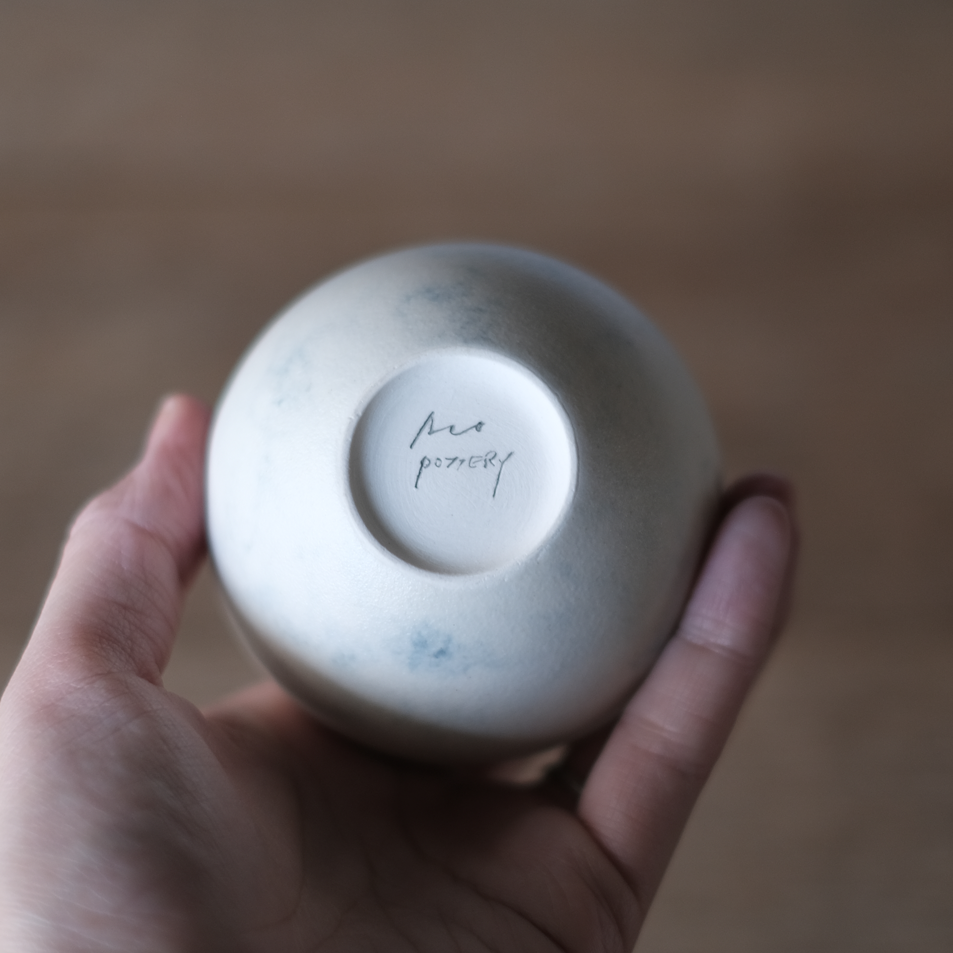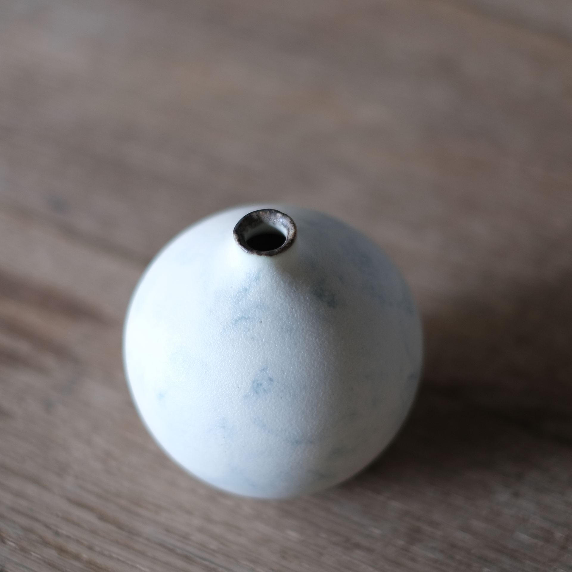 質感はなめらかで、表面は青い釉薬がところどころ表現されて大理石のような表情。また口の部分に施された優しいブラウンの釉薬が特徴です。