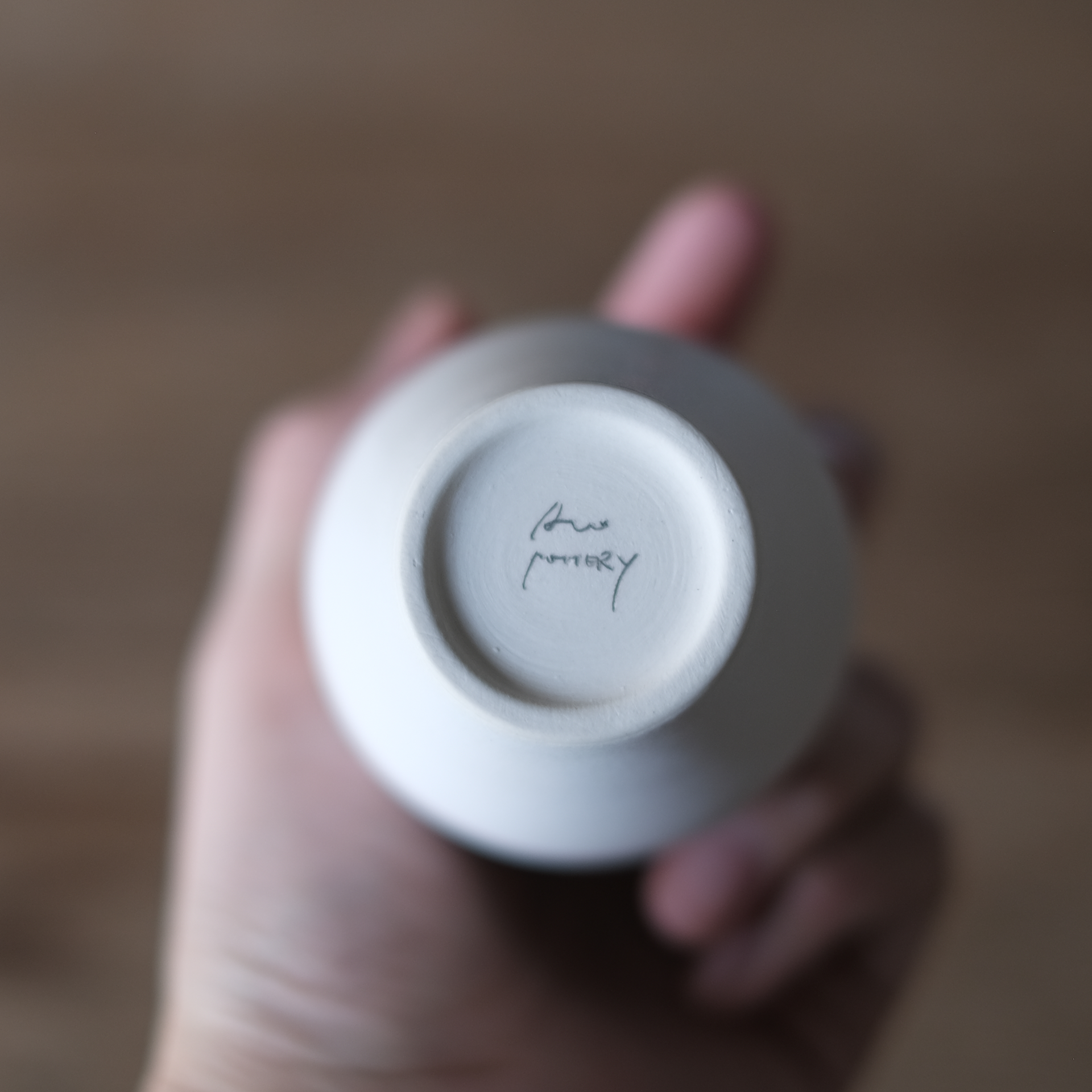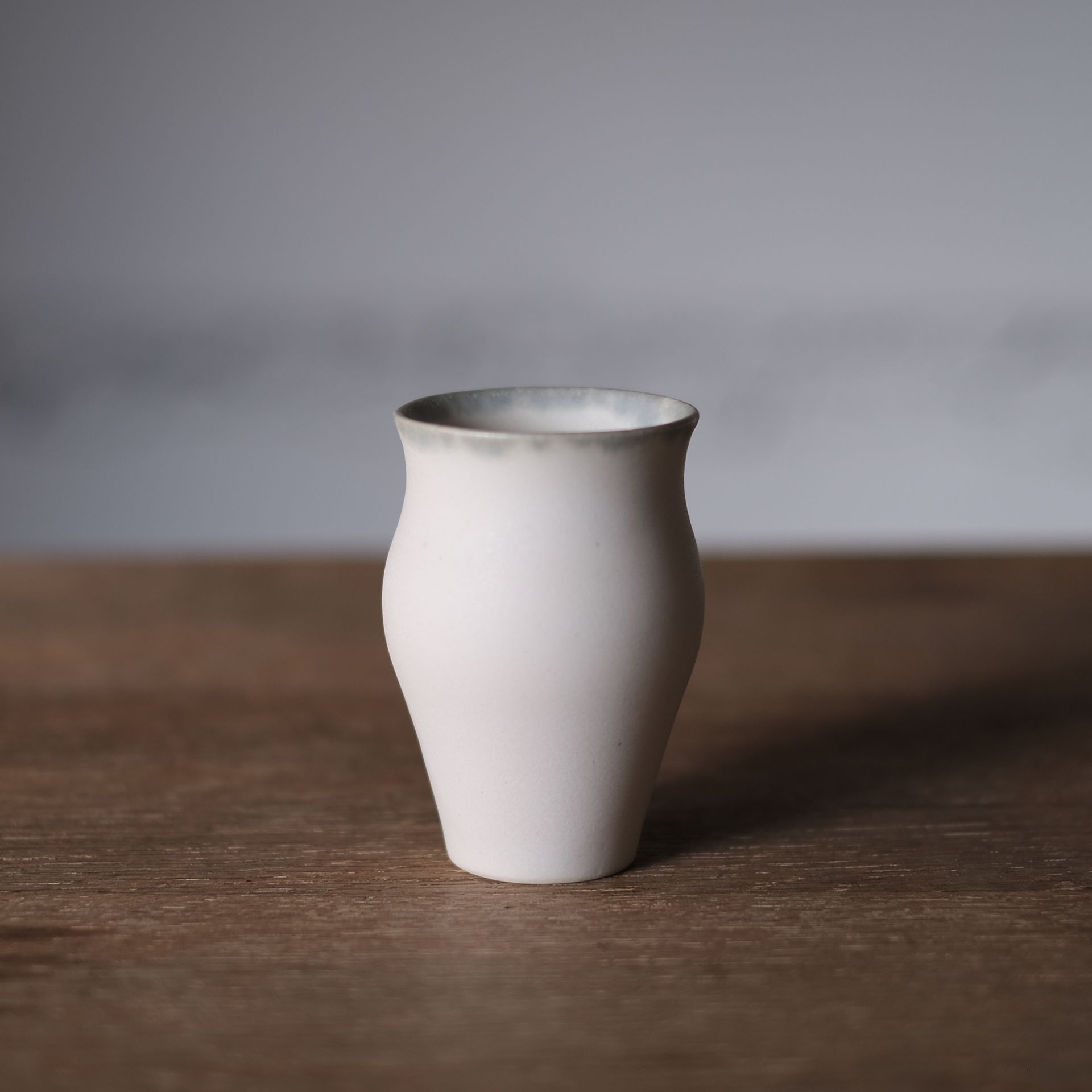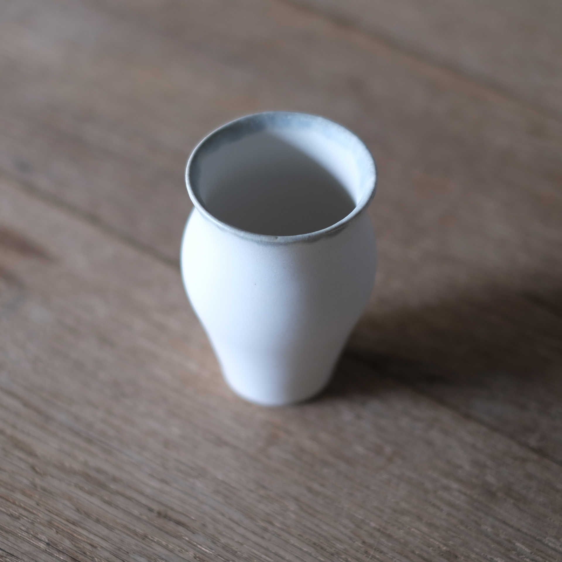 優しいブルーグレーの釉薬が口元に施され、雪のように綺麗な白いボディと調和。シンプルながらも凛とした佇まいが魅力です。