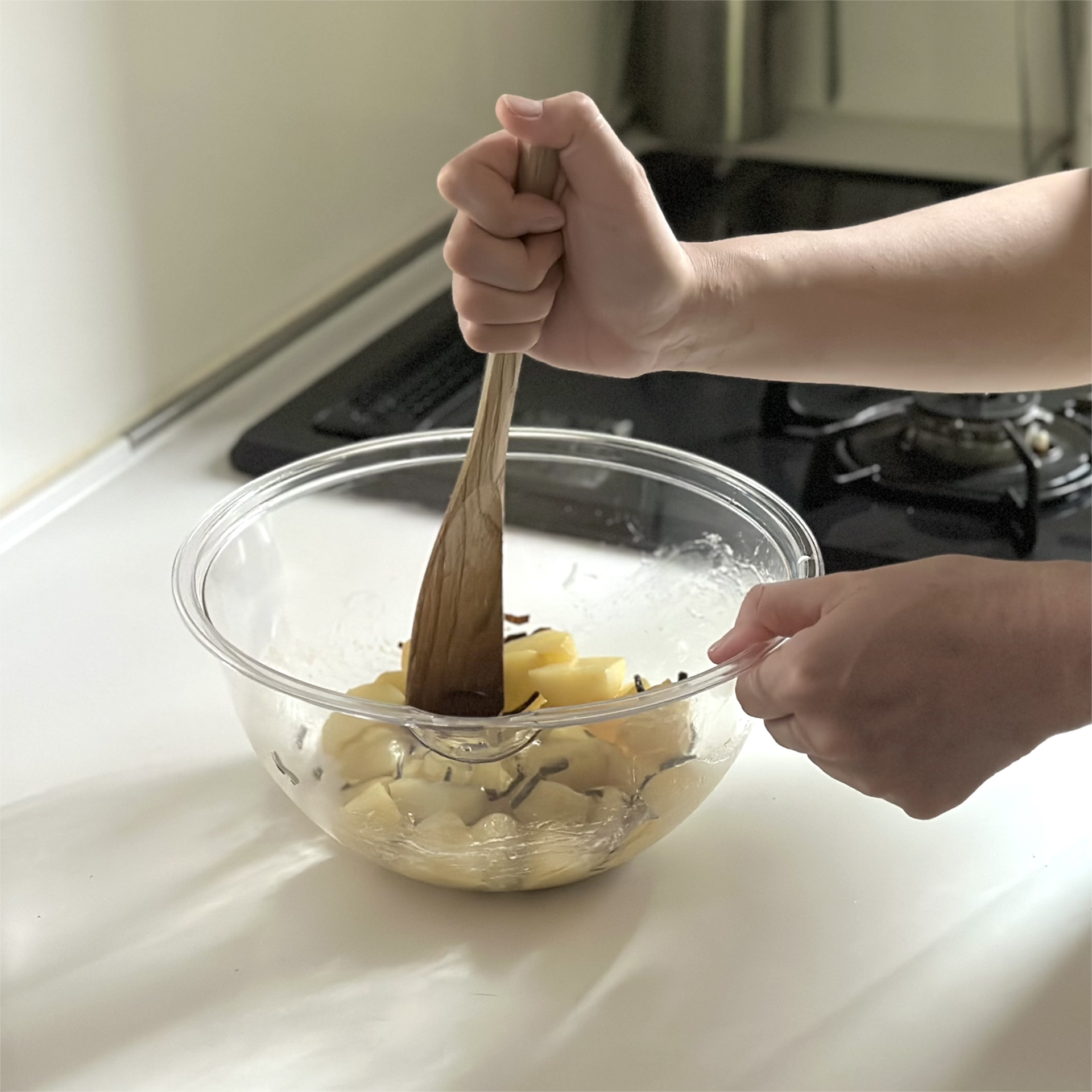 フライパンにひしめき合うピーマンの肉詰めや小さめのハンバーグなど、ピンポイントでスッと匙が食材の下に入りこんでくれますし、ポテトサラダなど食材を潰して混ぜるとき、あえものを混ぜるときも重宝します。