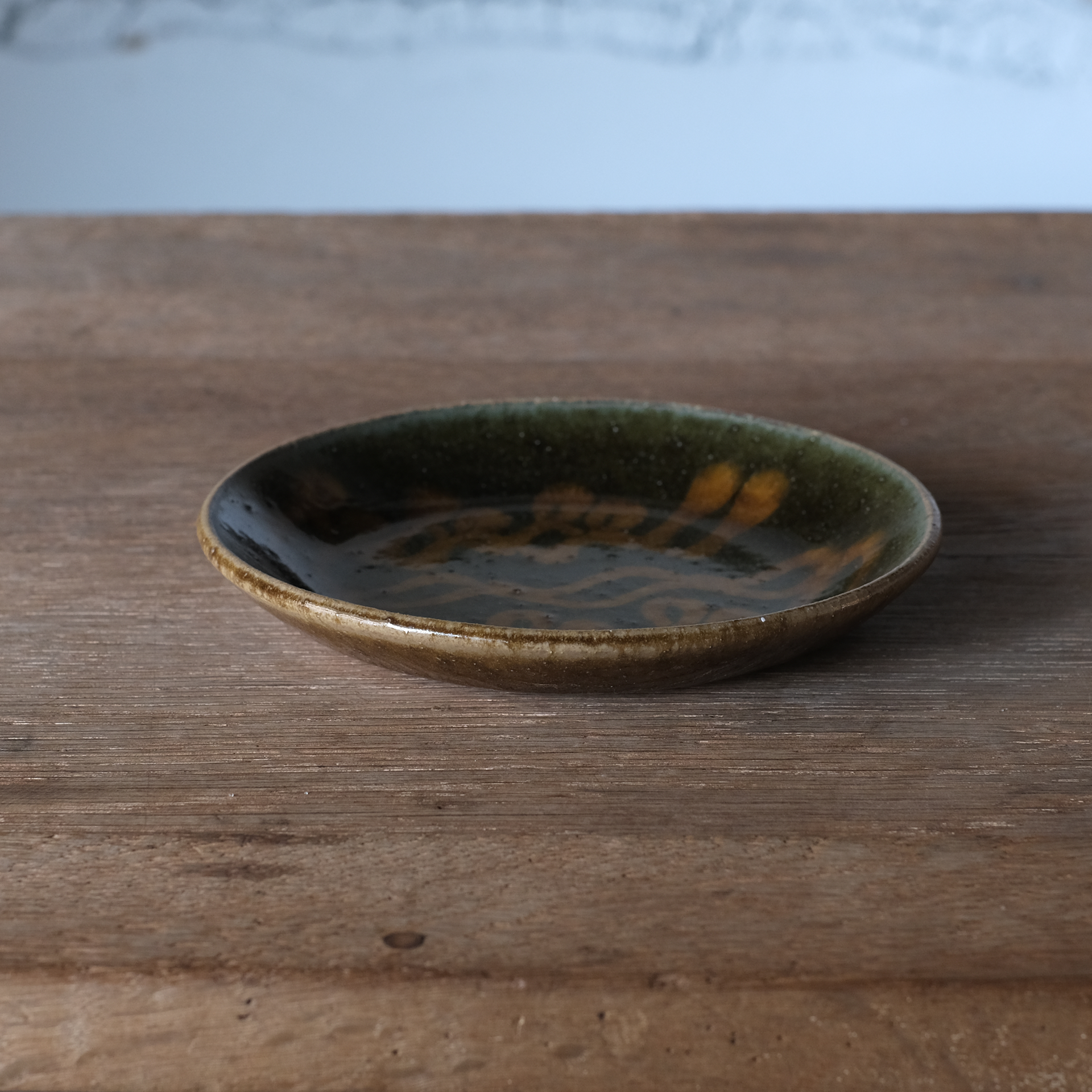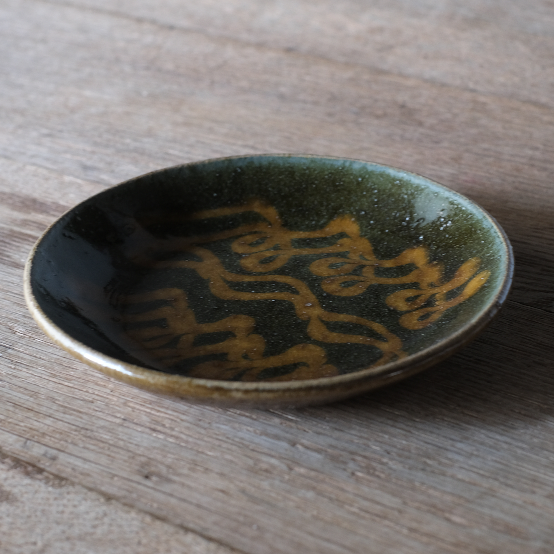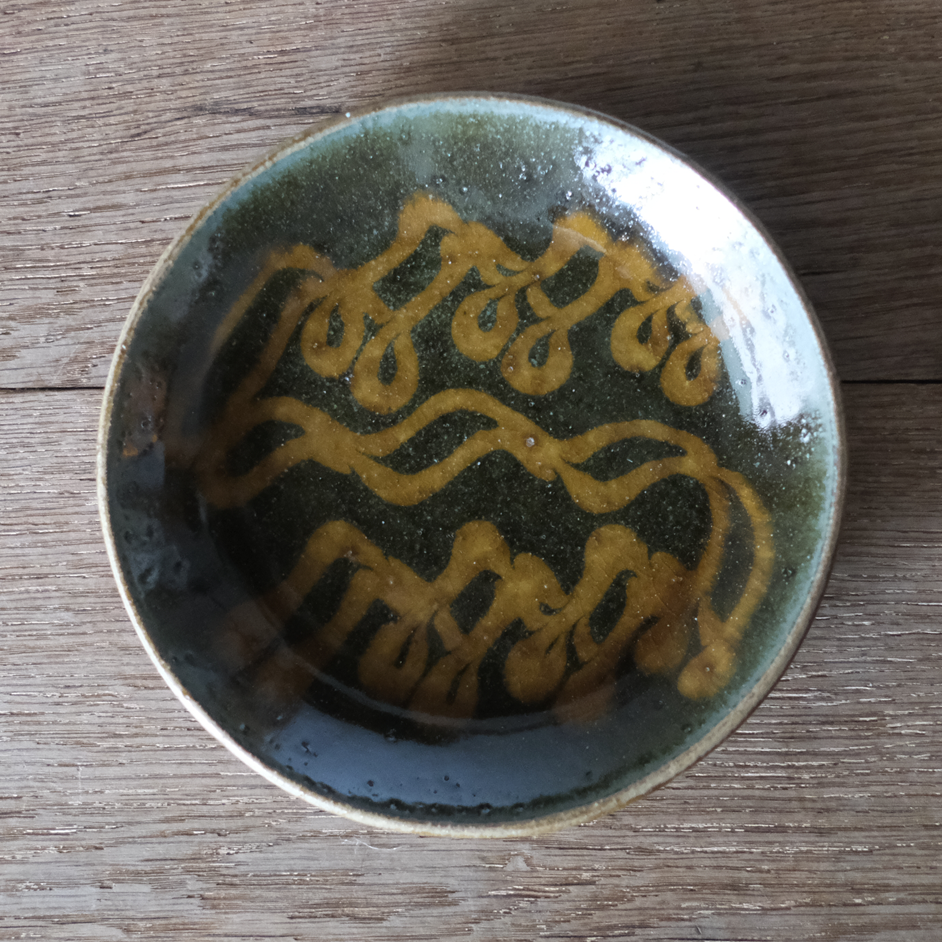 スリップウェアという、模様を描いてから成形するという技法でつくられたお皿です。