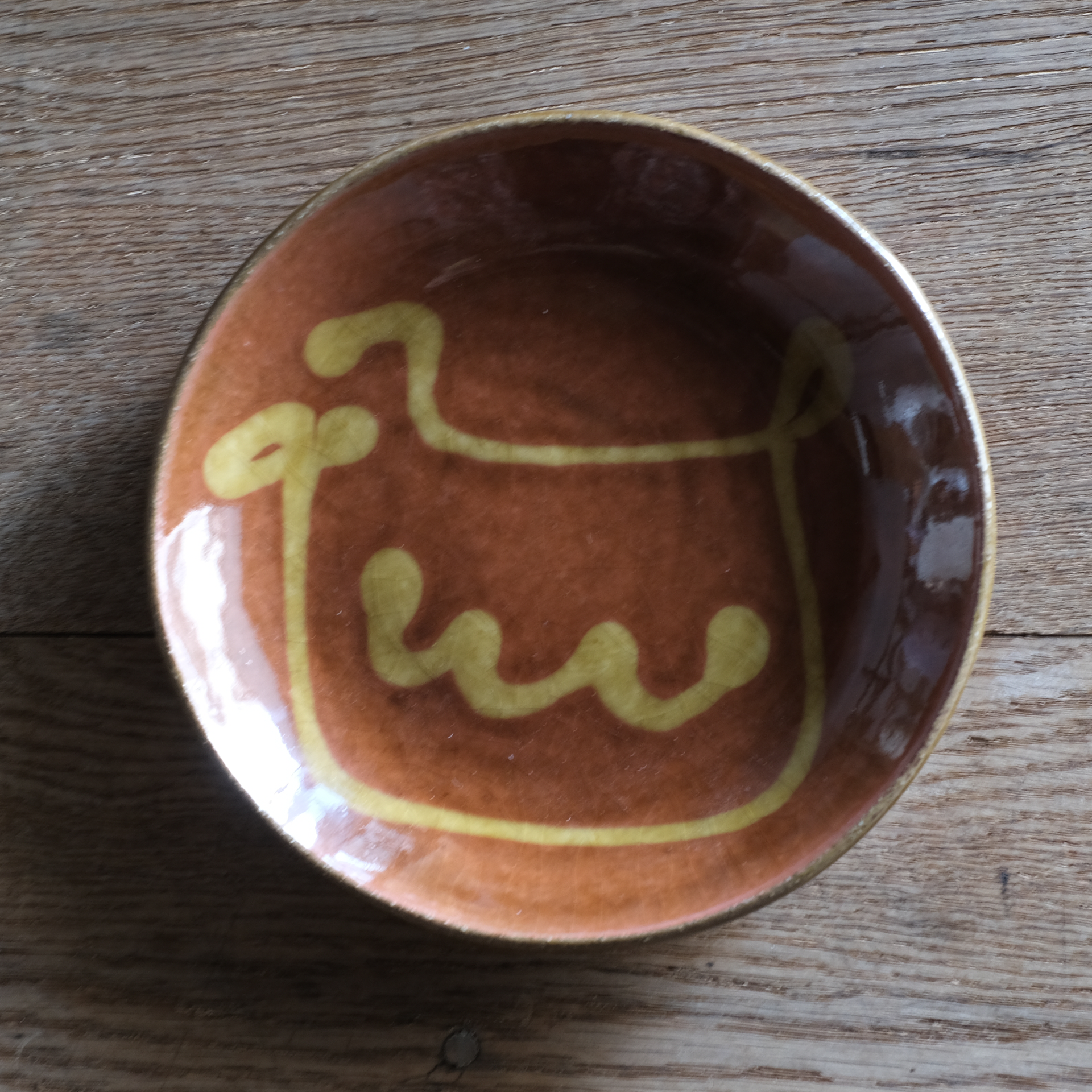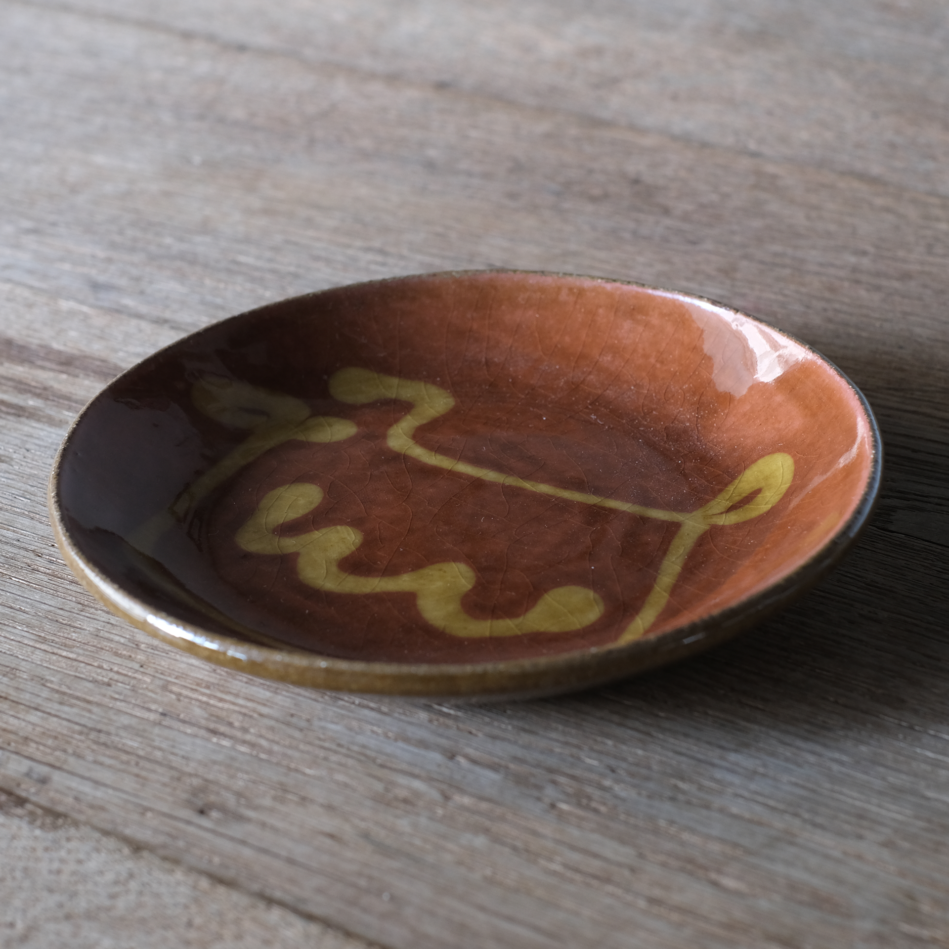 スリップウェアという、模様を描いてから成形するという技法でつくられたお皿です。